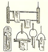 製材の仕方、なまこ壁の作り方、ねじが発生しなかった日本的万力の使い方、垂直の出し方などなど、実によく観察している。 ハードとしての建築だけではなく、その中で営まれる生活のディテールにもよく目が届いている。 手拭掛は、その構造が非常に簡易であるという点でぜひ見ておきたく思う。形態は多様であるが、その大半は素朴で、釣り下げ式になっている。ここに掲げたいくつかは一般に使用されているものである。もっとも簡単なものは太目の竹の一端に細い竹の輪を下げてあるにすぎない。いまひとつは、かなり一般に広く使用されているものだが、これは細い竹を頸木形に曲げてその両下端を太い竹に固定し、同時に、その太い竹と同形のもう一本の竹を頸木形にした竹によって上下に動かせるようにその両端を刺し通してある。この太い竹がその重みによって、下の固定して ある竹に掛けられた手拭いを押さえる働きをするのである。下−P24 上下2冊になったこの本は、ページ毎に筆者の手になる挿し絵が入っている。 その挿し絵がきわめて正確で、ついしばらく前のわが国の生活を、充分にしのばせてくれる。 かつてのわが国生活を振り返るには、最適の資料を提供してくれる。 眺めているだけでも楽しい本である。